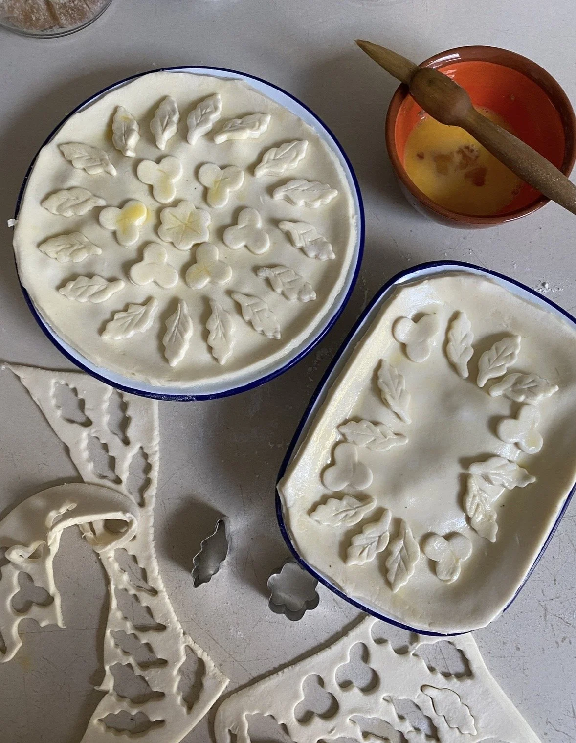 4. Preheat oven to 200°C fan. Drape the puff pastry over the pie dish, pressing gently to seal the edges and trim any overhang. Brush with beaten egg and score a small steam hole in the centre.
